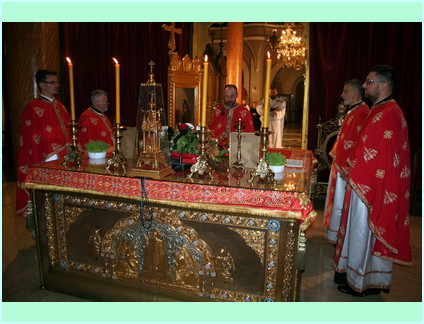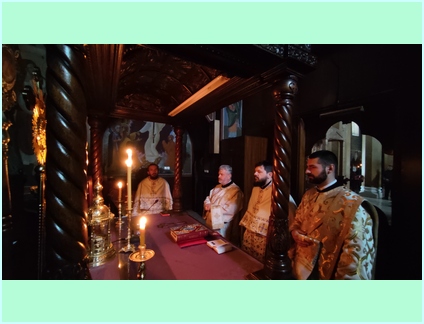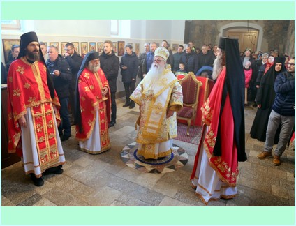 На светој литургији Његовом Високопреосвештенству саслуживали су: свештеноигуман Георгије Станковић, намјесник манастира Озерковићи, јеромонах Владимир Ђуричић, намјесник манастира Кнежина, јереји Немања Лакић и Томислав Пајевић, те ђакон Будимир Гардовић. На крају Свете литургије Високопреосвећени митрополит Хризостом преломио је колач и осветио кољиво у славу и част Светог Јована Златоустог.